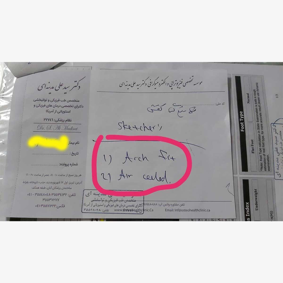 ما در زیر یک نسخه از دستور پزشک محترم جناب آقای دکتر علی مدینه ای متخصص طب فیزیکی و توان بخشی دکترای تخصصی درمان های فیزیکی و استئوپاتی از آمریکا را که برای فرد دارای کف پای صاف می باشد برای شما به نمایش گذاشته ایم که در آن قید شده خرید کفش اسکچرز آرچ فیت. پس همانطور که مشاهده می فرمایید پزشکان داخلی هم به استفاده از کفش اسکچرز اصل ARCH FIT برای افراد دارای کف پای صاف اعتقاد دارند. پس شما با خرید یک کفش اسکچرز اصل زنانه ARCH FIT و یا یک کفش اسکچرز اورجینال مردانه ARCH FIT به بهبود و راحتی خود بسیار کمک کرده اید.